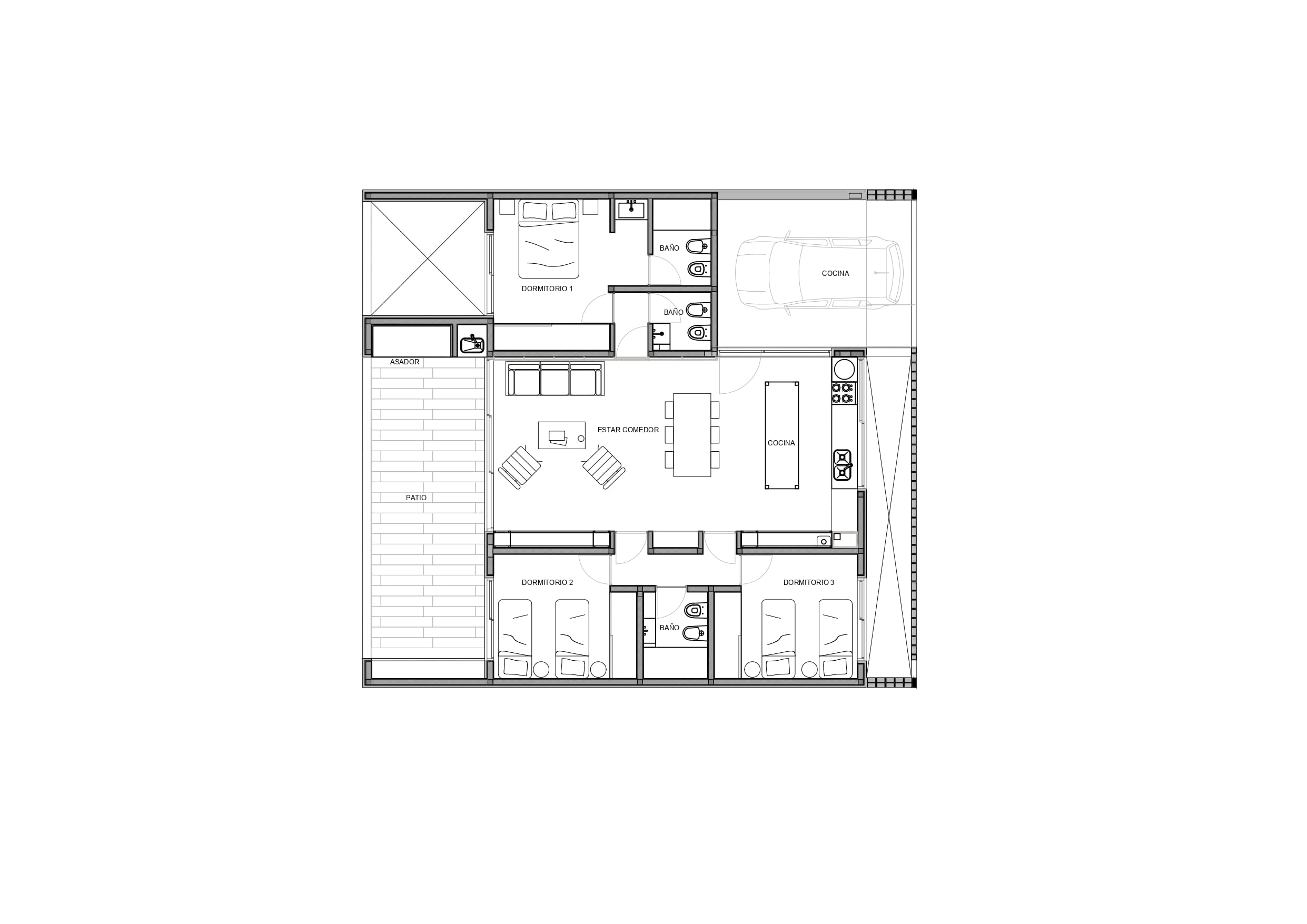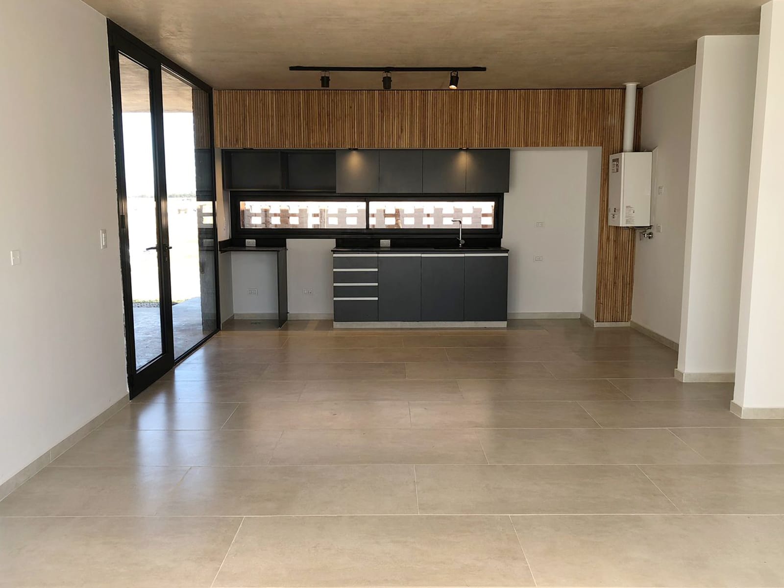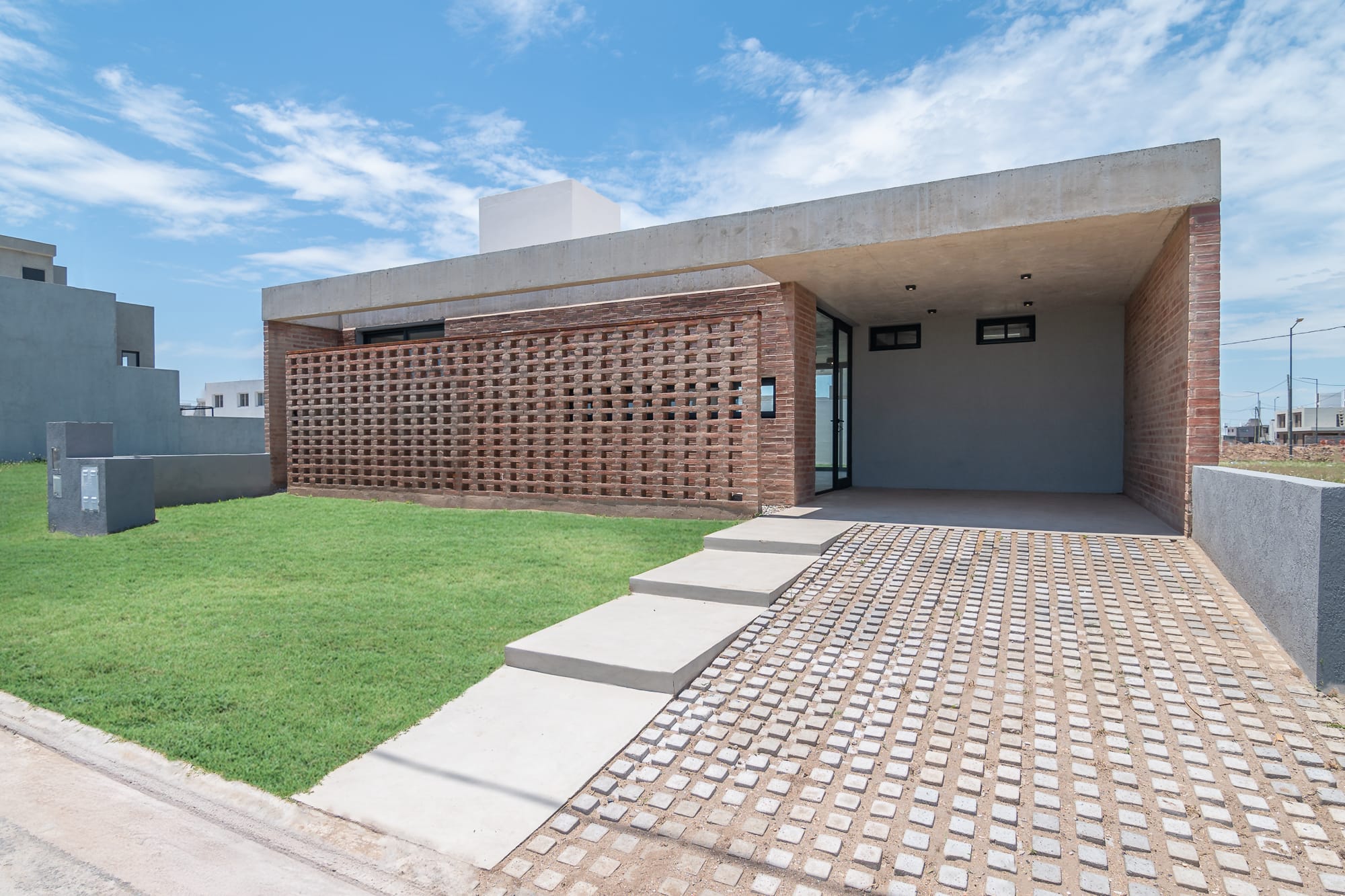 Esta vivienda de diseño contemporáneo y construcción tradicional se desarrolla en una sola planta, integrando funcionalidad, estética y confort. Cuenta con dormitorios con amplios placares, tres baños (uno en suite), cocina equipada, living-comedor luminoso y patio con asador. La galería, con pérgola metálica y techo impermeable, conecta fluidamente con el exterior. Detalles de hormigón visto, muros de ladrillo cribado, aberturas DVH y terminaciones de alta calidad realzan su propuesta arquitectónica.